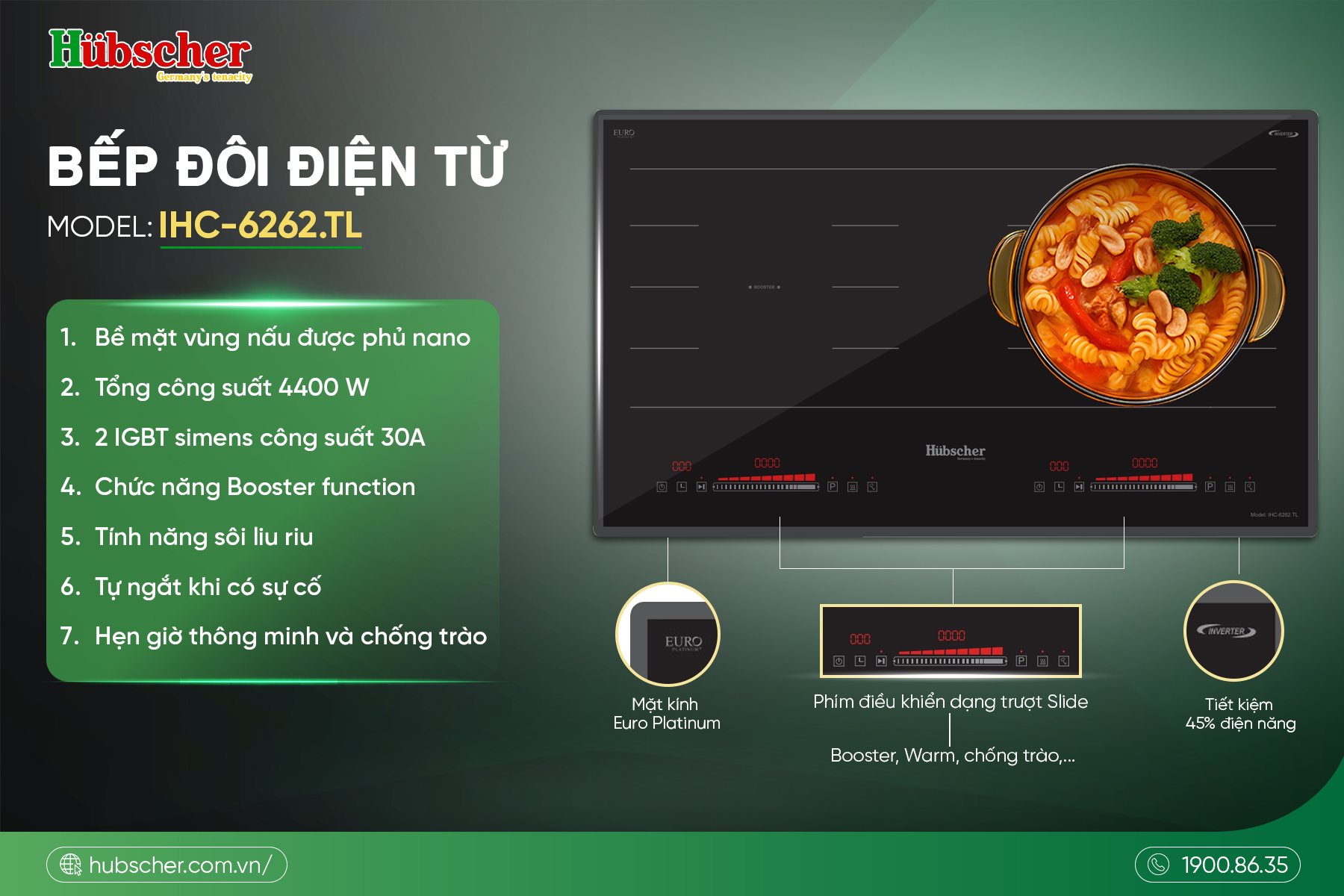 Không chỉ gây ấn tượng bởi thiết kế sang trọng, bếp từ đôi IHC-6262.TL còn chinh phục người dùng nhờ hiệu suất nấu mạnh mẽ, khả năng tiết kiệm điện vượt trội và hệ thống an toàn toàn diện. Sự kết hợp giữa mặt kính Euro Platinum cao cấp, công nghệ Inverter Econavi, linh kiện chuẩn châu Âu cùng các tiện ích thông minh giúp việc nấu nướng trở nên nhẹ nhàng, nhanh chóng và an tâm hơn mỗi ngày.