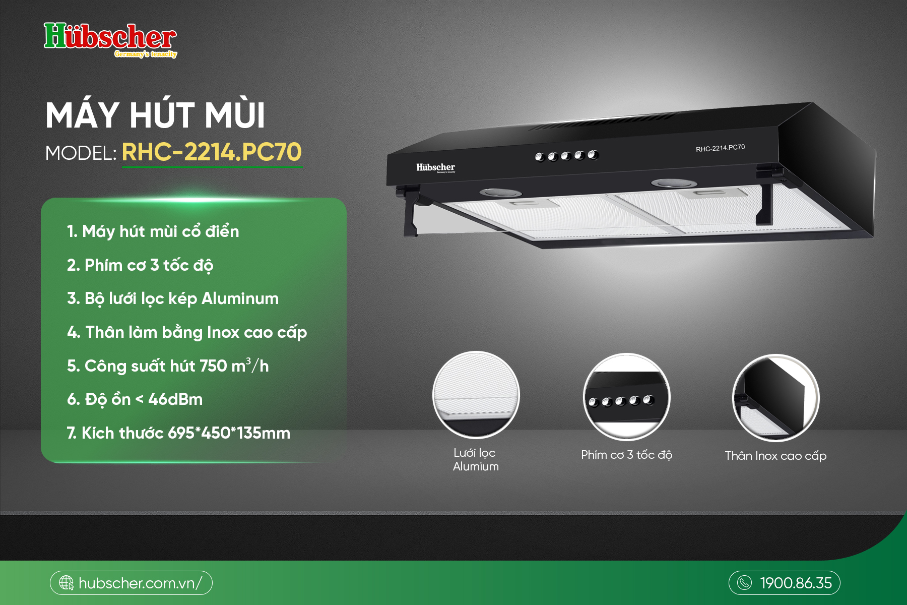 Máy hút mùi RHC-2214.PC70 – Thiết kế cổ điển gọn gàng, công suất hút 750m³/h cho không gian bếp sạch mùi