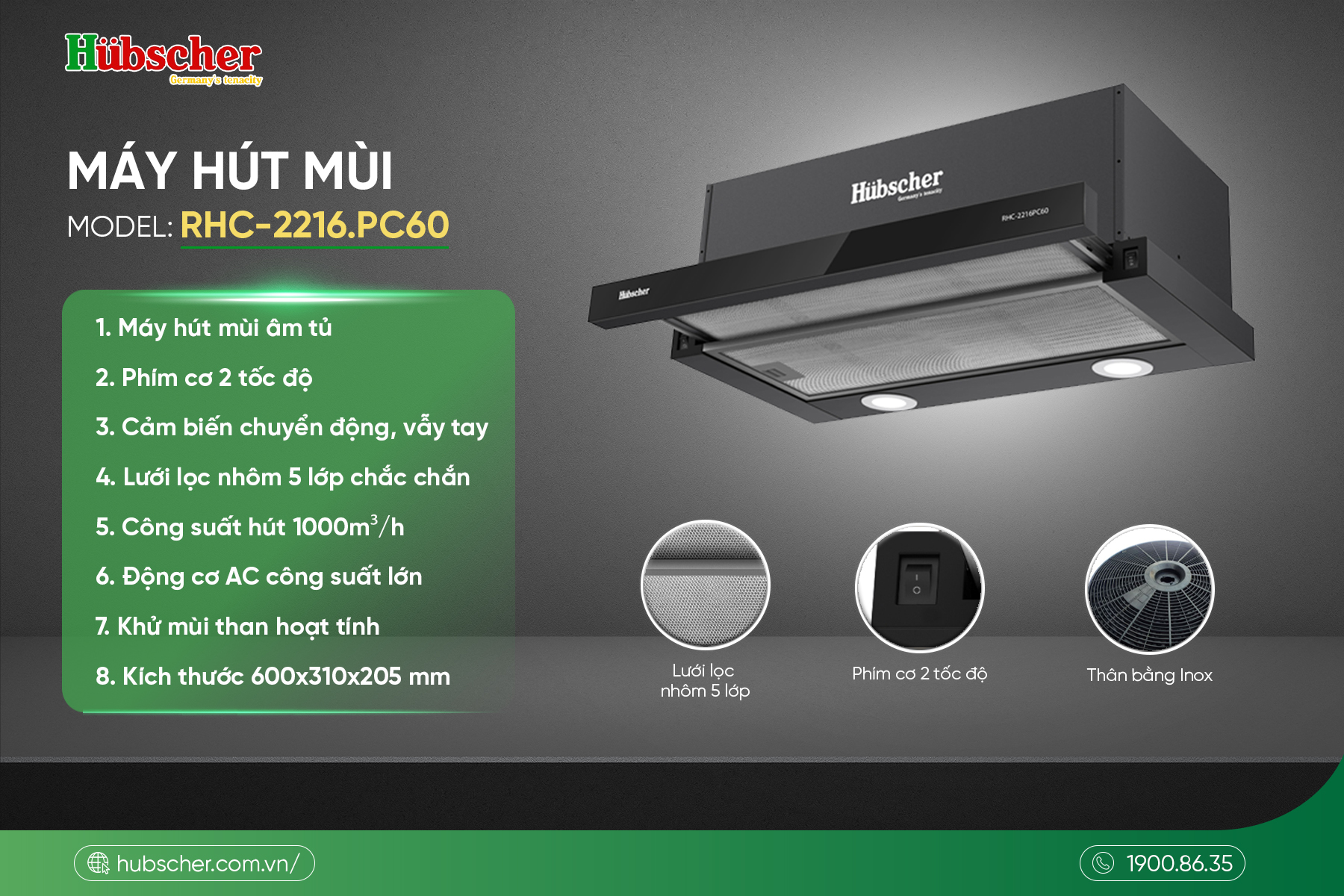 Với thiết kế âm tủ gọn gàng, công suất hút mạnh mẽ cùng khả năng vận hành êm ái, máy hút mùi Hubscher RHC-2216.PC60 là giải pháp lý tưởng giúp không gian bếp luôn sạch mùi và thông thoáng. Sự kết hợp giữa động cơ AC bền bỉ, lưới lọc nhôm 5 lớp và than hoạt tính khử mùi hiệu quả không chỉ nâng cao trải nghiệm nấu nướng mà còn góp phần bảo vệ sức khỏe cho cả gia đình.