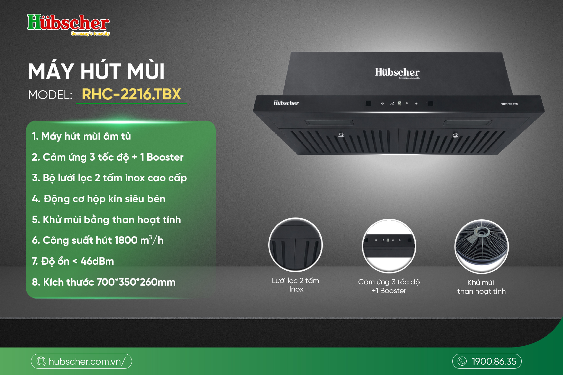 Với thiết kế âm tủ gọn gàng, công suất hút mạnh mẽ lên đến 1800m³/h, động cơ bền bỉ cùng hệ thống điều khiển cảm ứng hiện đại, máy hút mùi RHC-2216.TBX là lựa chọn phù hợp cho nhiều không gian bếp gia đình.