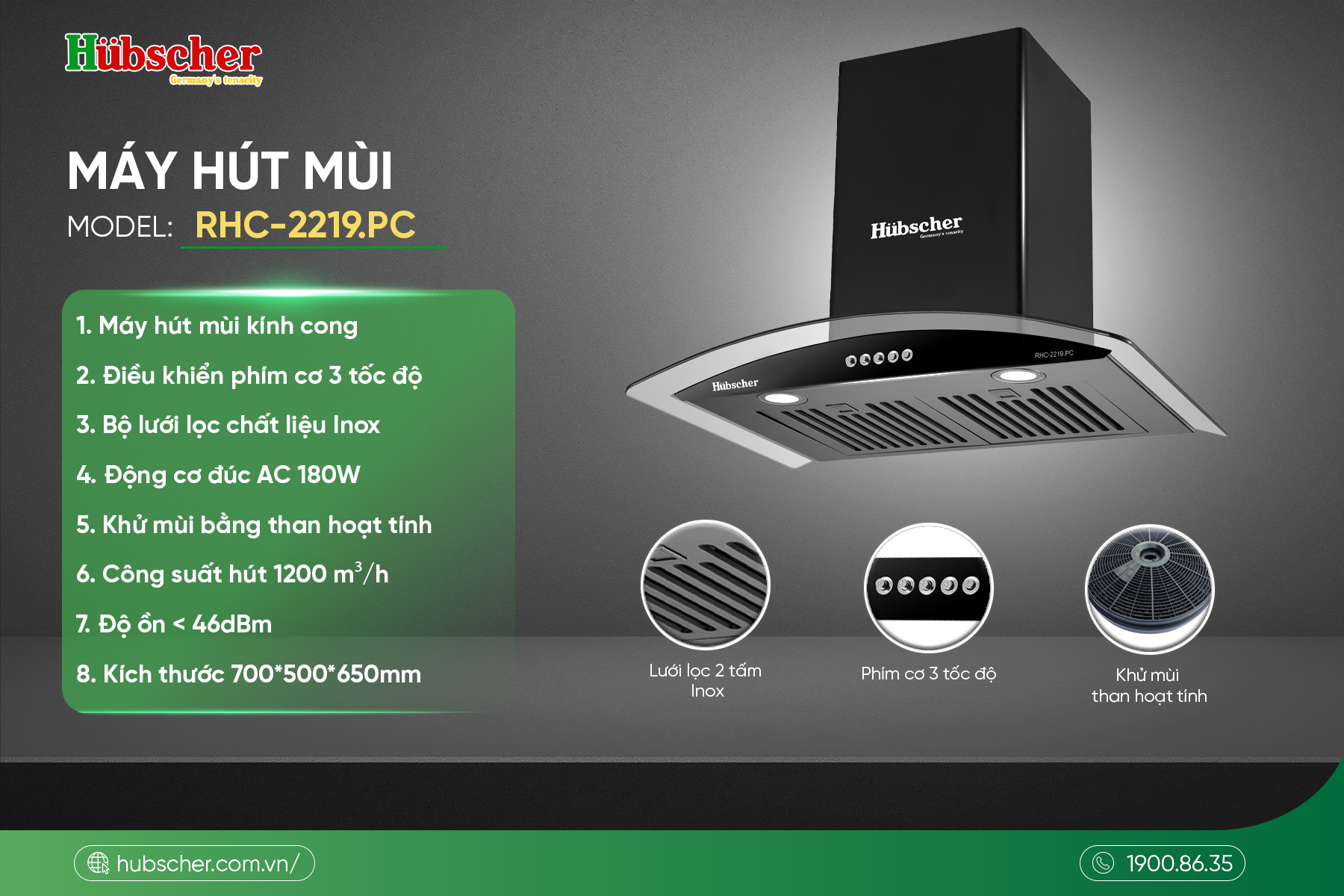 Máy hút mùi RHC-2219.PC ra đời nhằm mang lại giải pháp làm sạch không khí hiệu quả trong gian bếp. Sản phẩm sở hữu thiết kế kính cong tinh tế, động cơ AC 180W mạnh mẽ cùng công suất hút 1200m³/h, giúp loại bỏ nhanh chóng mùi thức ăn và khói bếp. Đây là lựa chọn phù hợp cho những gia đình muốn giữ cho căn bếp luôn thoáng mát và sạch sẽ.