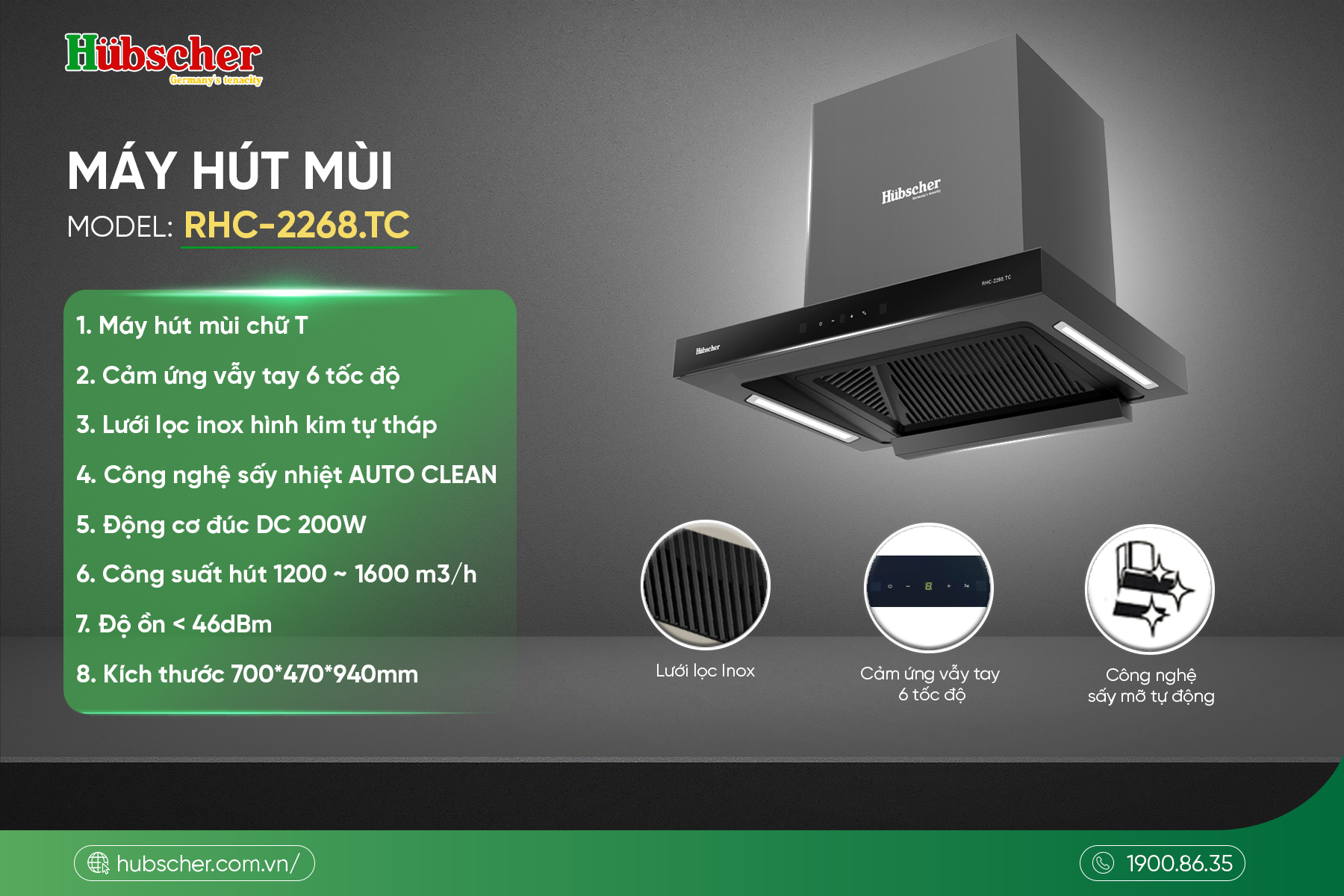 Dòng máy hút mùi chữ T RHC-2268.TC động cơ DC 200W mang đến giải pháp toàn diện với công suất hút mạnh mẽ, hệ thống điều khiển thông minh và đặc biệt là công nghệ sấy nhiệt tự làm sạch, giúp giảm thiểu công sức vệ sinh đáng kể.